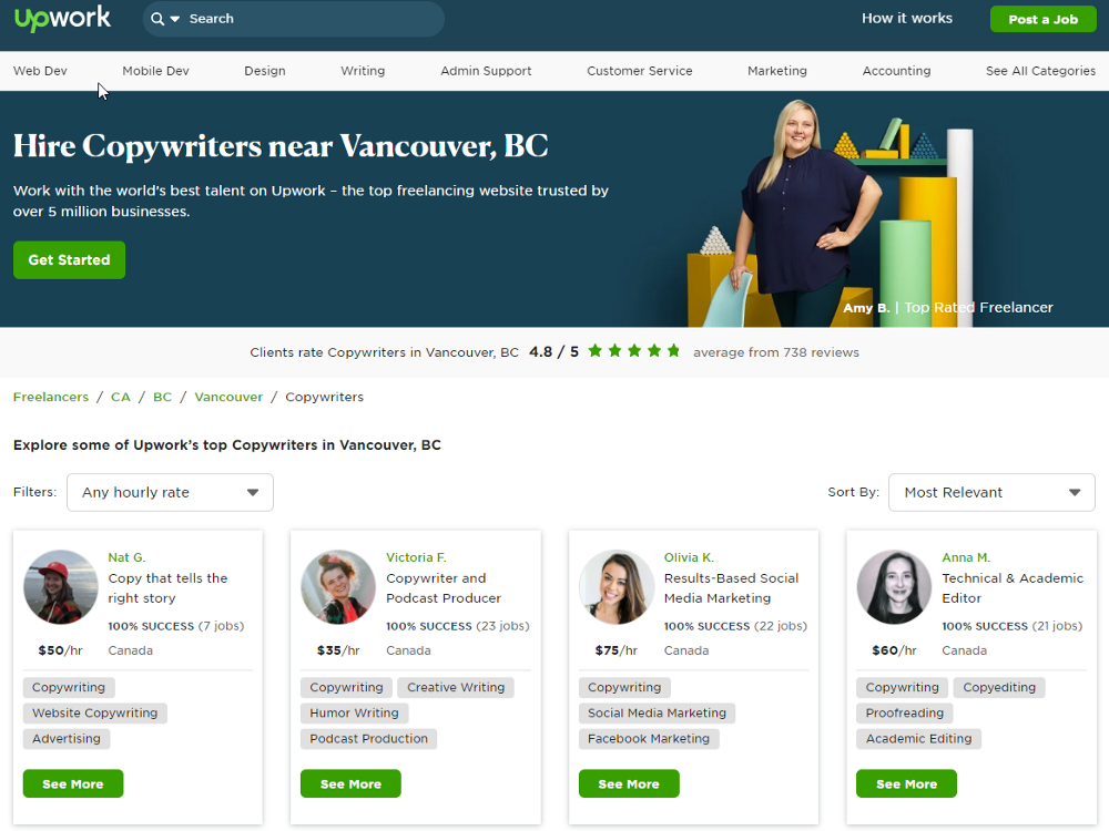 My writing income now comes from various places and I’m actively seeking new connections all the time. I still have plenty of clients on Upwork and regularly get job invites that I sometimes have to decline. After making $3000 on the platform, I’m a Top Rated freelancer, and the second suggestion if you search for copywriters in Vancouver.