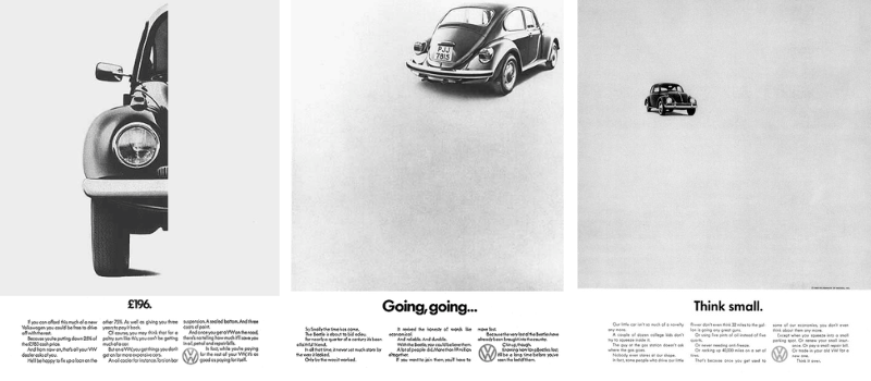 When I first saw it, it reminded me of the classic American print ads you used to see in newspapers. Here are a few of them I love from Volkswagen that ran in newspaper ads in the 1960s.